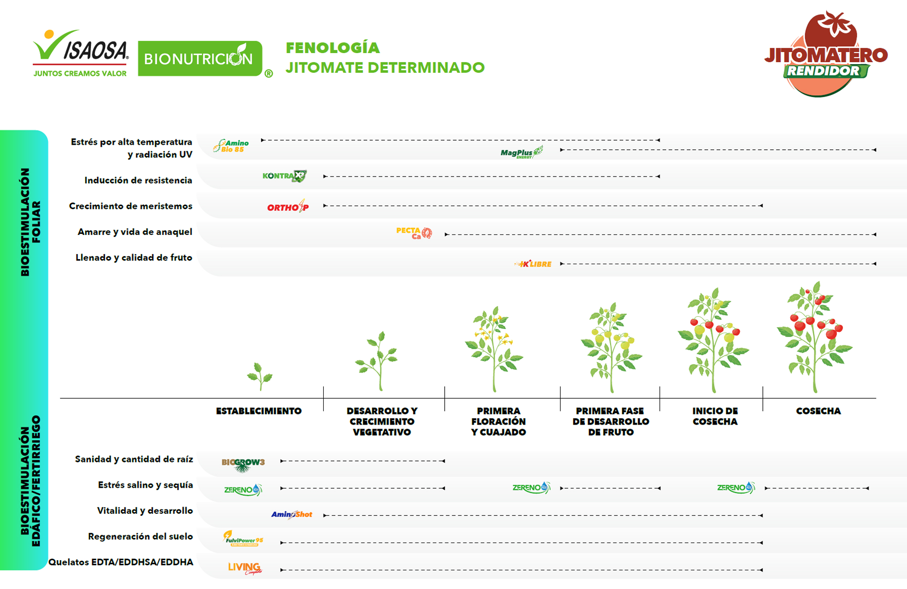 El cultivo de jitomate requiere temperaturas entre 20 °C y 28 °C, alta luminosidad y humedad relativa de 60–80 %. Se desarrolla mejor en suelos franco-arenosos o franco-limosos, bien drenados, con pH entre 6.0 y 6.8 y alta materia orgánica. El riego debe ser regular y controlado, preferentemente por goteo, evitando encharcamientos que provocan rajado de frutos y enfermedades. En etapa vegetativa demanda más nitrógeno, mientras que en floración y fructificación se incrementa fósforo y potasio, junto con micronutrientes como calcio, magnesio, boro, zinc y hierro. El manejo incluye tutorado, poda de chupones y control fitosanitario constante. Se eligen variedades determinadas o indeterminadas según el sistema de cultivo, y la cosecha ocurre entre 70 y 90 días tras el trasplante, cuando los frutos alcanzan color y tamaño comercial.